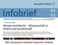 Infobrief des Deutschen Ethikrates erschienen mit Berichten zur Arbeit im zweiten HalbjahrAm 16.12.25 hat der Deutsche Ethikrat den Infobrief 02/25 mit Berichten zu seiner Arbeit in der zweiten Jahreshälfte 2025 veröffentlicht. Der 16-seitige Infobrief ist auf der Ethikrat-Webseite kostenlos als PDF-Download abrufbar. mehr ... |