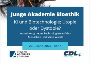 Vom 29.-30.11.2025 in Bonn gibt es wieder die Junge Akademie Bioethik, diesmal zum Thema: „KI und Biotechnologie: Utopie oder Dystopie?“ Veranstalter sind die Jungen Christdemokraten für das Leben (CDL) in Zusammenarbeit mit der Konrad-Adenauer-Stiftung.